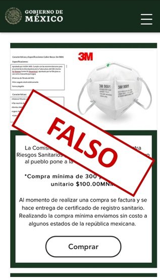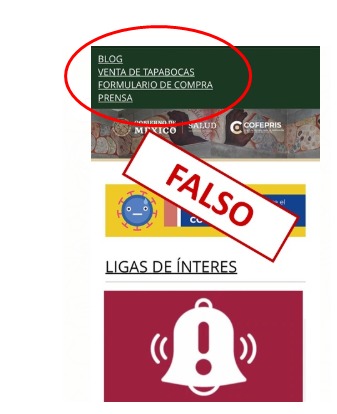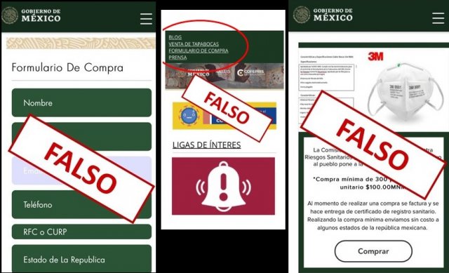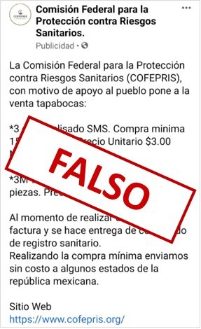 Recientemente “la COFEPRIS sufrió una suplantación reciente por una página falsa que ofrecía en venta cubrebocas por lo que esta institución alertó a la ciudadanía para que no caigan en fraudes y se deslindó de esa página web que ofrecía productos en su nombre”.