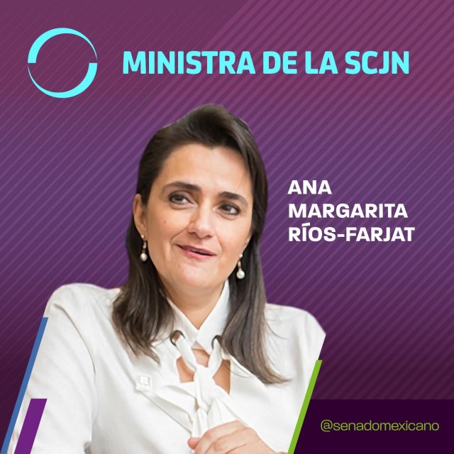 Ana Margarita Ríos-Farjat, se venía desempeñando hasta la víspera como titular del Sistema de Administración Tributaria (SAT); las otras dos contendientes, integrantes de la terna para llegar la Corte, fueron la académica Ana Laura Magaloni, que obtuvo 25 votos y la subsecretaria de Gobernación, Diana Álvarez Maury, que sólo obtuvo 1 voto.