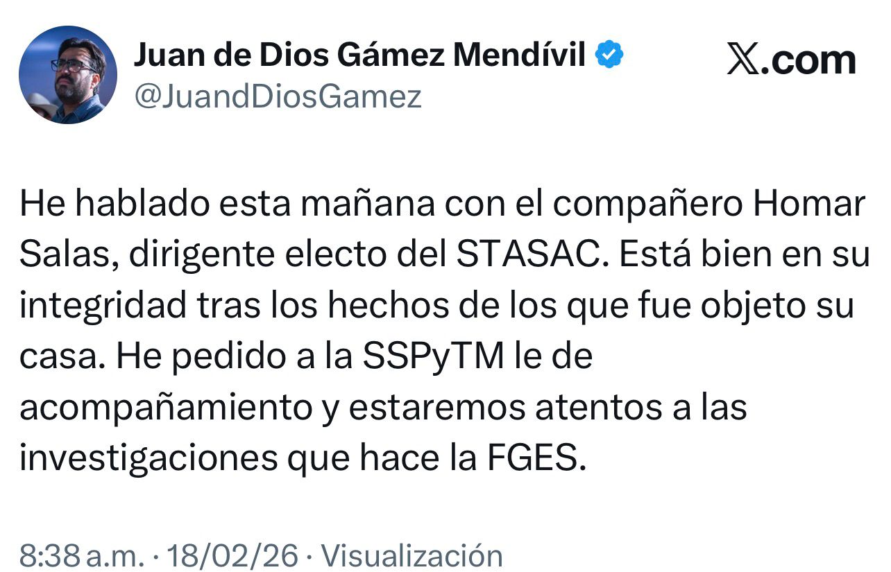 Agentes de la policía mantienen bajo resguardo la vivienda mientras los peritos de la Fiscalía General del Estado realizan las diligencias necesarias. Hasta el momento, las autoridades no reportan personas detenidas ni han establecido el móvil de la agresión contra la propiedad del líder sindical.