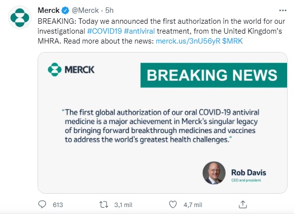 “Es gratificante alcanzar este hito y demostrar que el extraordinario esfuerzo de nuestros colaboradores, pacientes, médicos y equipo y los sacrificios personales realizados han logrado ahora ese importante objetivo. También es gratificante ver que se produce la primera autorización mundial en el Reino Unido, el mismo lugar donde administramos molnupiravir al primer voluntario humano valiente ” agregó Holman