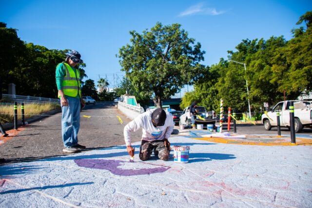 La intervención con pintura urbana que se lleva a cabo en el crucero de las avenidas Rafael Buelna y Vicente Riva Palacio, ubicado en el sector Centro de la ciudad como parte de la iniciativa Pasos por la Paz, registra avances significativos.