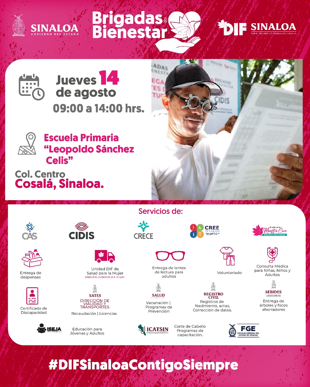 Con el propósito de atender a la población sinaloenses  con servicios de salud, asistencia social y médica, este jueves 14 de agosto llegarán al municipio de Cosalá las Brigadas del Bienestar del Sistema DIF Sinaloa para atender a las familias de manera gratuita y mejorar su bienestar y calidad de vida.