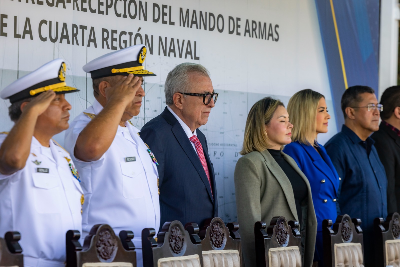 El Gobernador Rubén Rocha Moya, acompañado de Yeraldine Bonilla Valverde, secretaria General de Gobierno y la alcaldesa Estrella Palacios Domínguez, asistió como invitado de honor a la ceremonia de entrega-recepción del mando de armas de la Cuarta Región Naval, con sede en el puerto de Mazatlán donde asumió el cargo como comandante accidental el Vicealmirante Edy Alberto Meléndez Cedillo en sustitución del Vicealmirante DEM José Daniel Reséndiz.