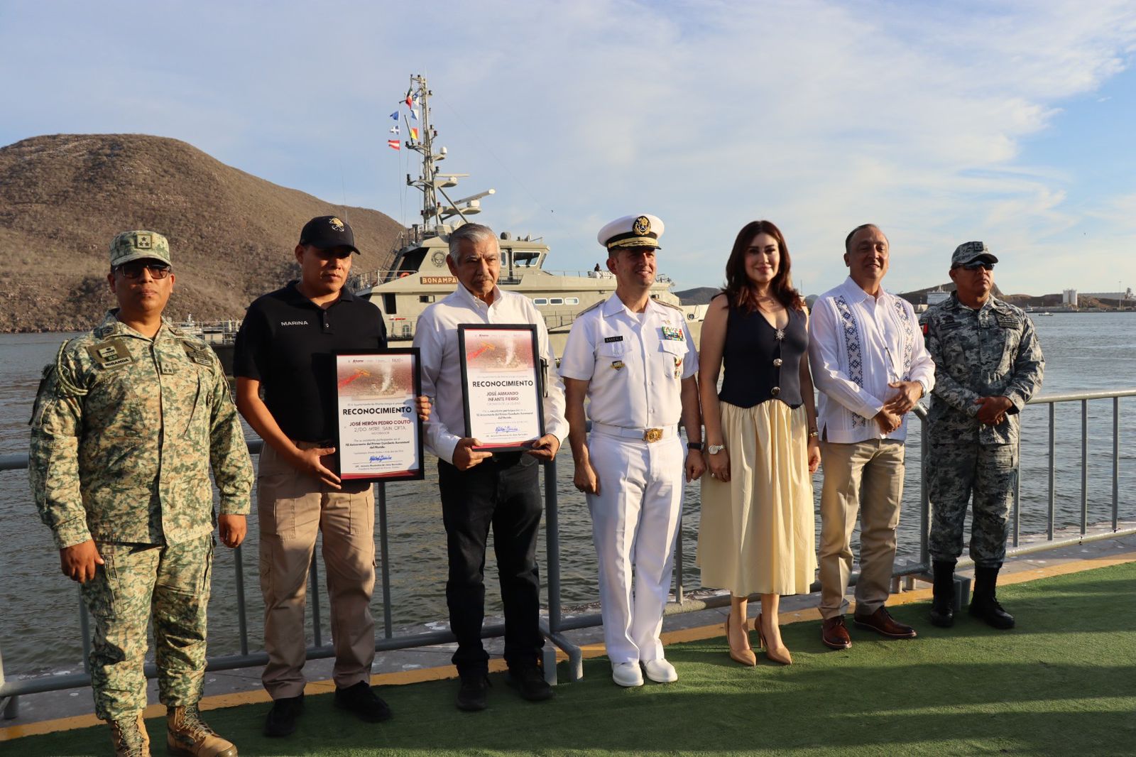 Como parte de la ceremonia, el Ayuntamiento de Ahome entregó reconocimientos a José Herón Pedro Couto, historiador, y a José Armando Infante Fierro, cronista de la ciudad, por su excelente participación en el 112 Aniversario del Primer Combate Aeronaval del Mundo, en un acto que resaltó la aportación de quienes preservan la memoria histórica de la región.