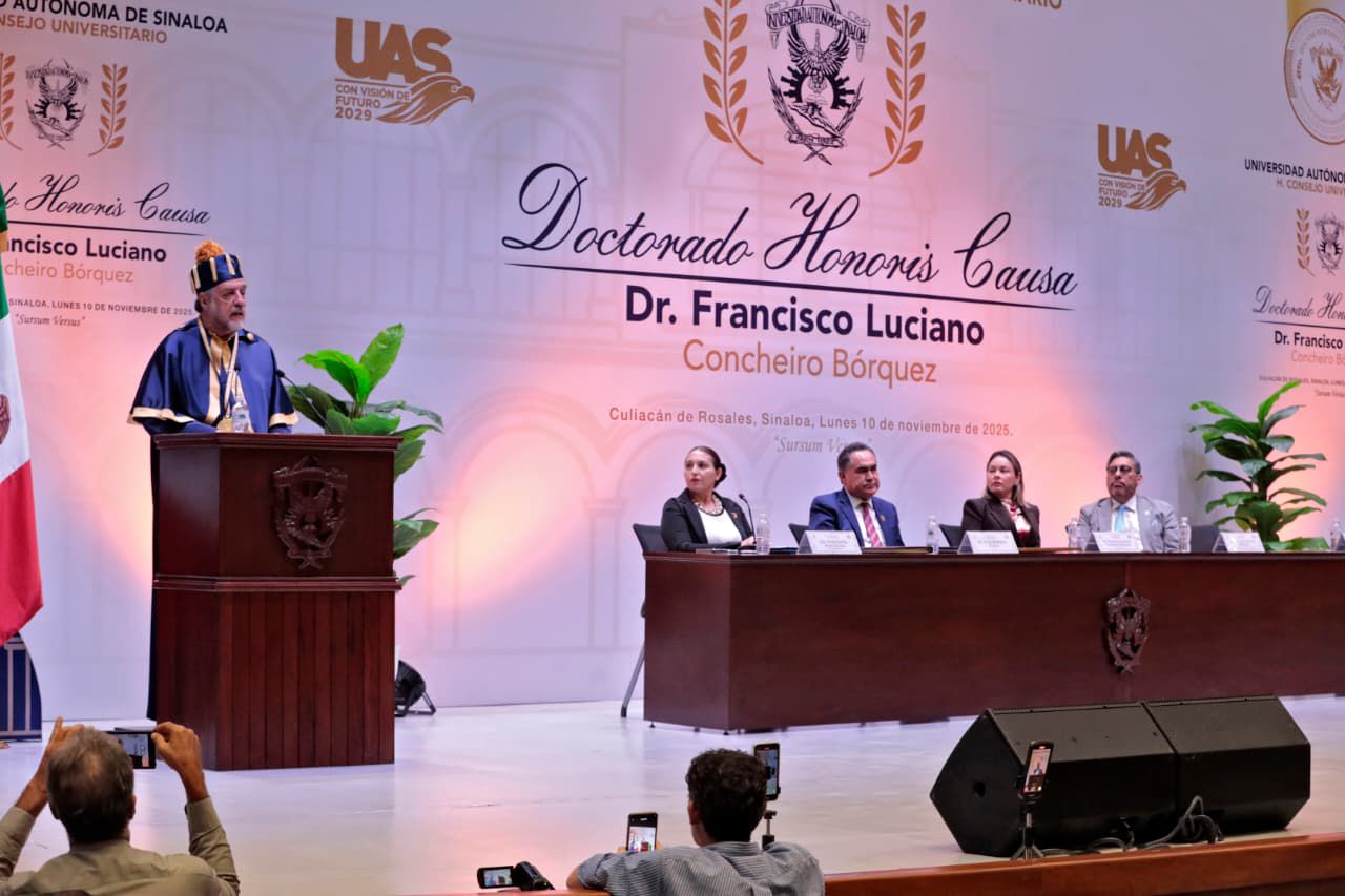 “El señor Gobernador reconoce el compromiso y apoyo que el doctor Concheiro ha mantenido con la Universidad Autónoma de Sinaloa, por lo cual expresa por mi conducto, su más sincera gratitud. Una vez más la UAS es lugar de convergencia y motivo de común, interés y compromiso, generosa como siempre ha sido, se honra asimisma al honrar a figuras ejemplares como el doctor Luciano Concheiro, quien resume en su propia trayectoria, las claves de su tiempo, tiempos de cambios profundos, de mujeres y hombres comprometidos con la ciencia, la justicia y especialmente con las universidades”, dijo.