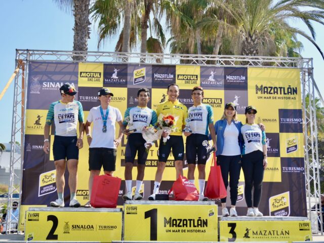 El gobernador Rubén Rocha Moya, acompañado de Mireya Sosa, secretaria de Turismo y Estrella Palacios alcaldesa de Mazatlán, encabezó la premiación de los primeros lugares de las rutas Larga y Corta de L´Étape Mazatlán by Tour de France, celebrada este domingo en el puerto.