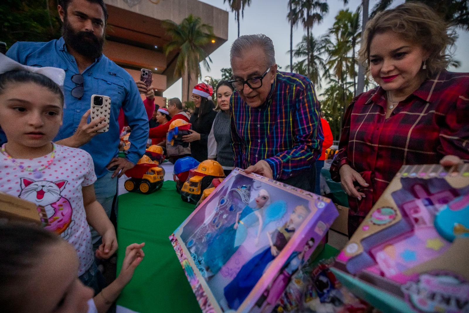 Acompañado por su hija, la presidenta del Sistema DIF Sinaloa, Eneyda Rocha Ruiz, y por cientos de personas, el gobernador Rubén Rocha Moya encabezó una sencilla pero emotiva ceremonia que cada año se hace en la explanada de Palacio de Gobierno, como es el encendido del monumental árbol de Navidad, junto con la apertura de la Villa Navideña.