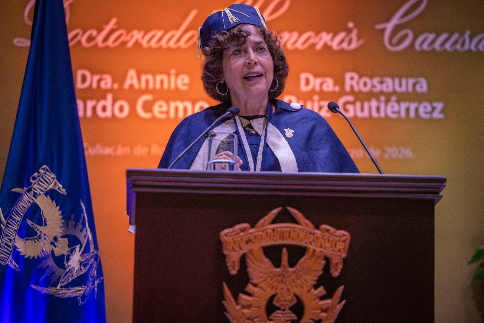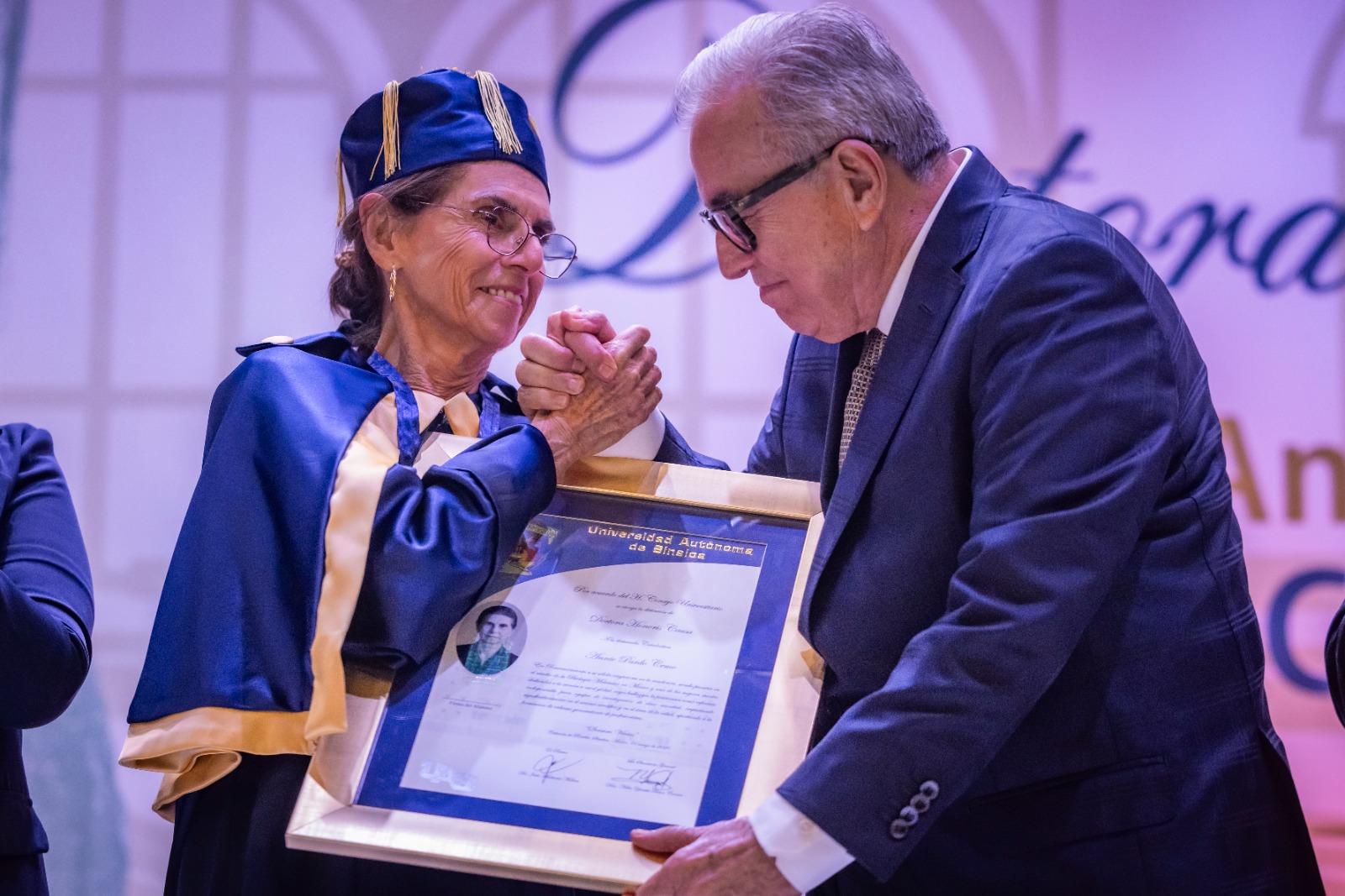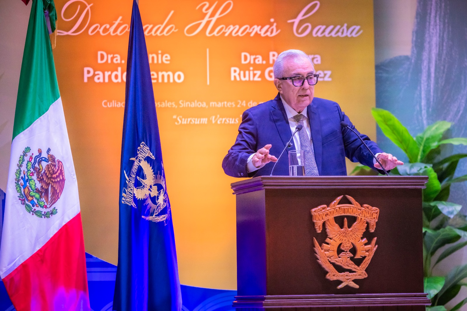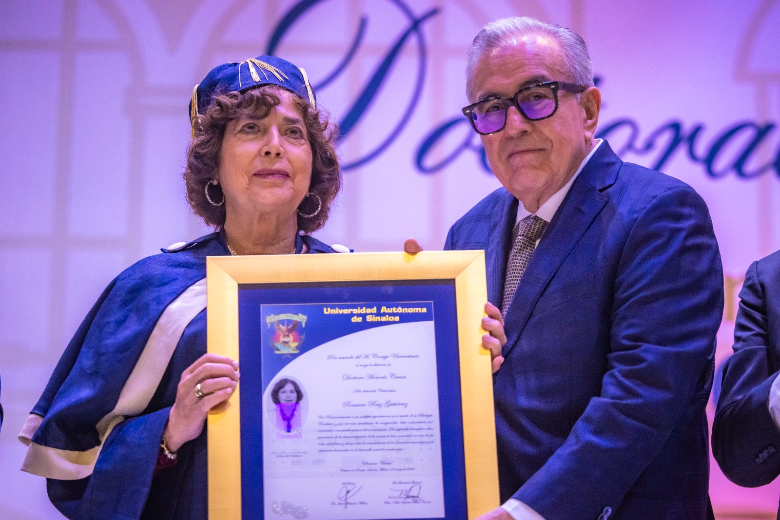 En una ceremonia solemne celebrada en el auditorio del Campus Rafael Buelna de la Máxima Casa de Estudios, junto al Honorable Consejo Universitario, el Gobernador Rocha, afirmó que las doctoras Annie Pardo y Rosaura Ruiz, han ensanchado el horizonte del saber y contribuido a la formación de científicos y científicas mexicanos y de otras latitudes, a lo largo de varias décadas.