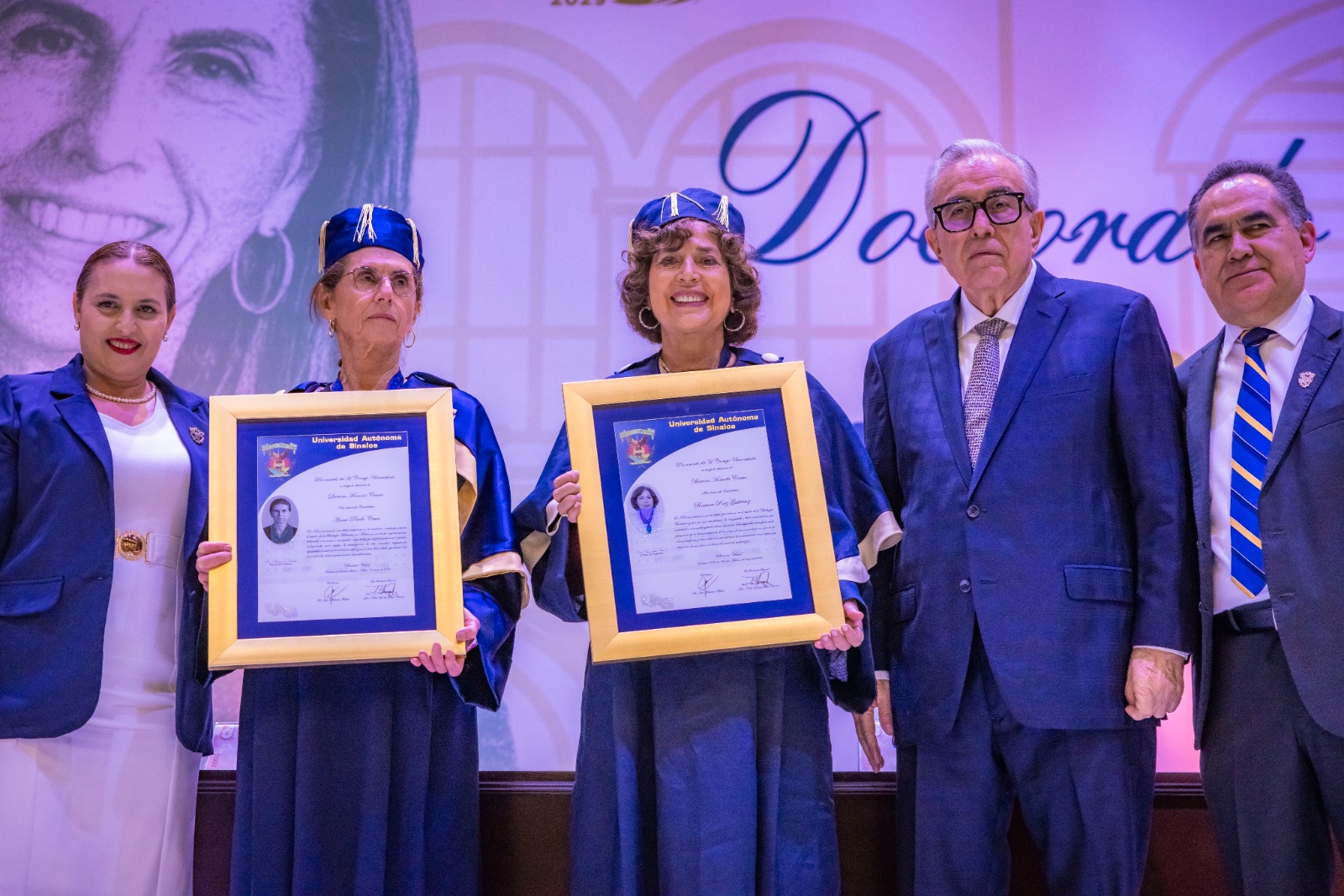 Reconociendo sus destacadas trayectorias, así como sus significativos aportes a la investigación y la ciencia, el gobernador Rubén Rocha Moya, acompañado del Rector de la Universidad Autónoma de Sinaloa, Jesús Madueña Molina, otorgaron el Doctorado Honoris Causa, a las Dras. Annie Pardo Cemo y Rosaura Ruiz Gutiérrez, destacando sus invaluables contribuciones a la sociedad.