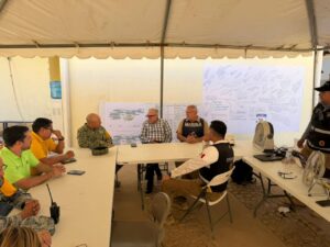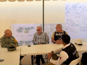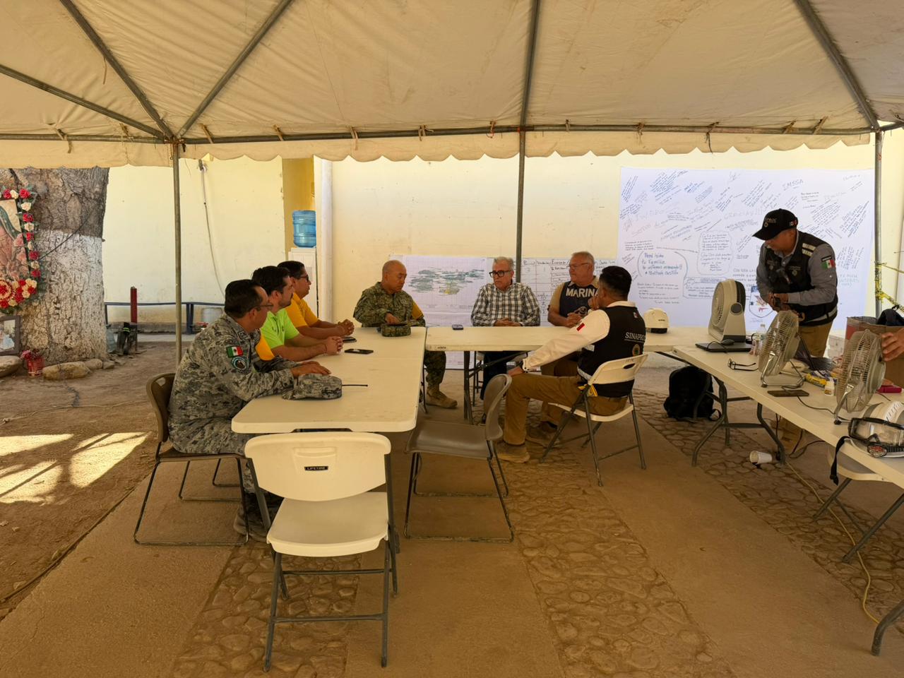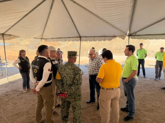 Pendiente del operativo para rescatar al minero que aún permanece en la mina Santa Fe, el gobernador Rubén Rocha Moya, visitó, la tarde de hoy, la zona de búsqueda en el municipio serrano, donde se reunió con personal que encabeza las tareas de rescate.