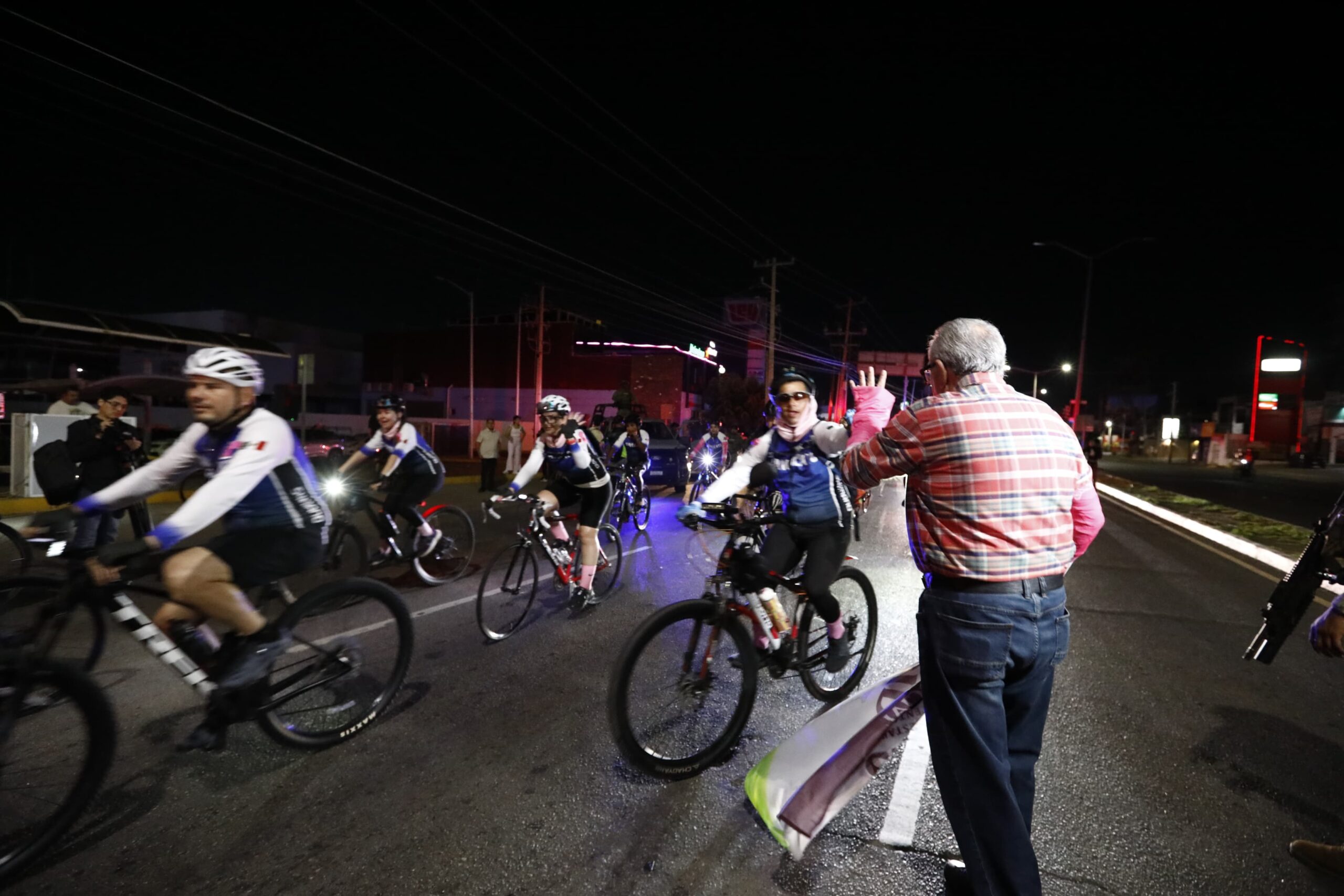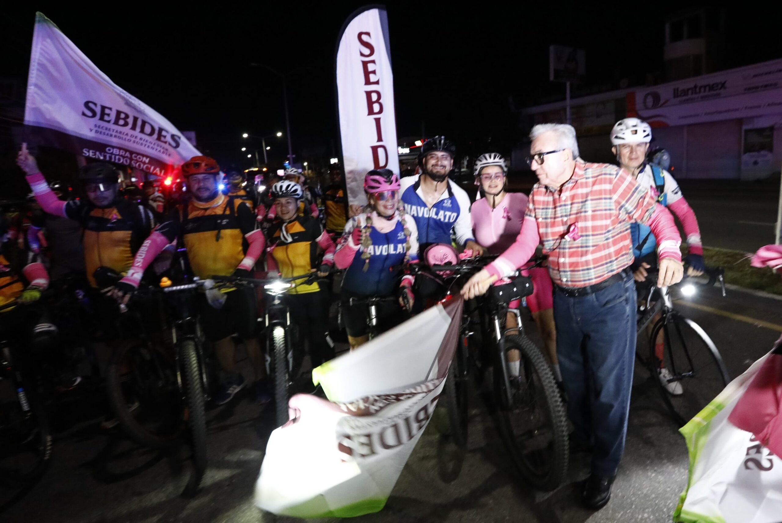 En esta rodada, el gobernador Rocha y María Inés Pérez, secretaria de SEBIDES, compartieron unos momentos con más de 750 ciclistas reflexionando los participantes en pro de concientizar sobre la importancia de la salud y el bienestar de la mujer, y la detección oportuna del cáncer de mama.