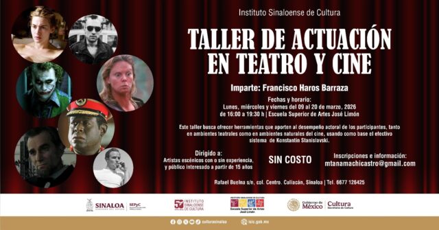 El Instituto Sinaloense de Cultura, a través de la Dirección de Formación y Capacitación, impartirá de 09 al 20 de marzo en las instalaciones de la Escuela Superior de Artes José Limón, una nueva edición del Taller de Actuación en Teatro y Cine, a cargo del maestro Francisco Haros Barraza, con carácter gratuito.