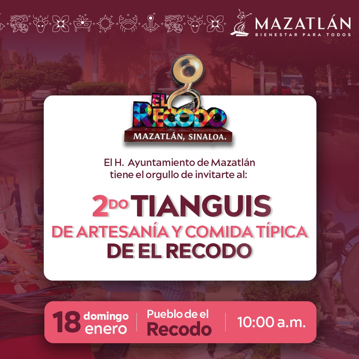 Mazatlán, Sinaloa, 16 de enero de 2026.- Refrendando el compromiso de impulsar la reactivación económica en la zona rural, el Gobierno Municipal de Mazatlán, encabezado por la Presidenta Estrella Palacios Domínguez, invita a la ciudadanía a participar en la celebración de la segunda edición del Tianguis de Artesanías y Comida Típica de El Recodo.