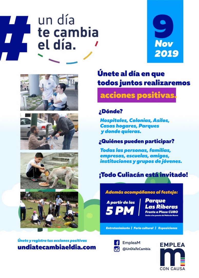 Con la intención de solidarizarse con los culiacanenses luego de los desafortunados del pasado jueves 17 de octubre en la Ciudad, y con la idea de seguir promoviendo causas para hacer de Culiacán una ciudad de paz, la Asociación Civil Emplea M Con Causa, ha lanzado el movimiento “Un día te cambia el día” este próximo 09 de noviembre.