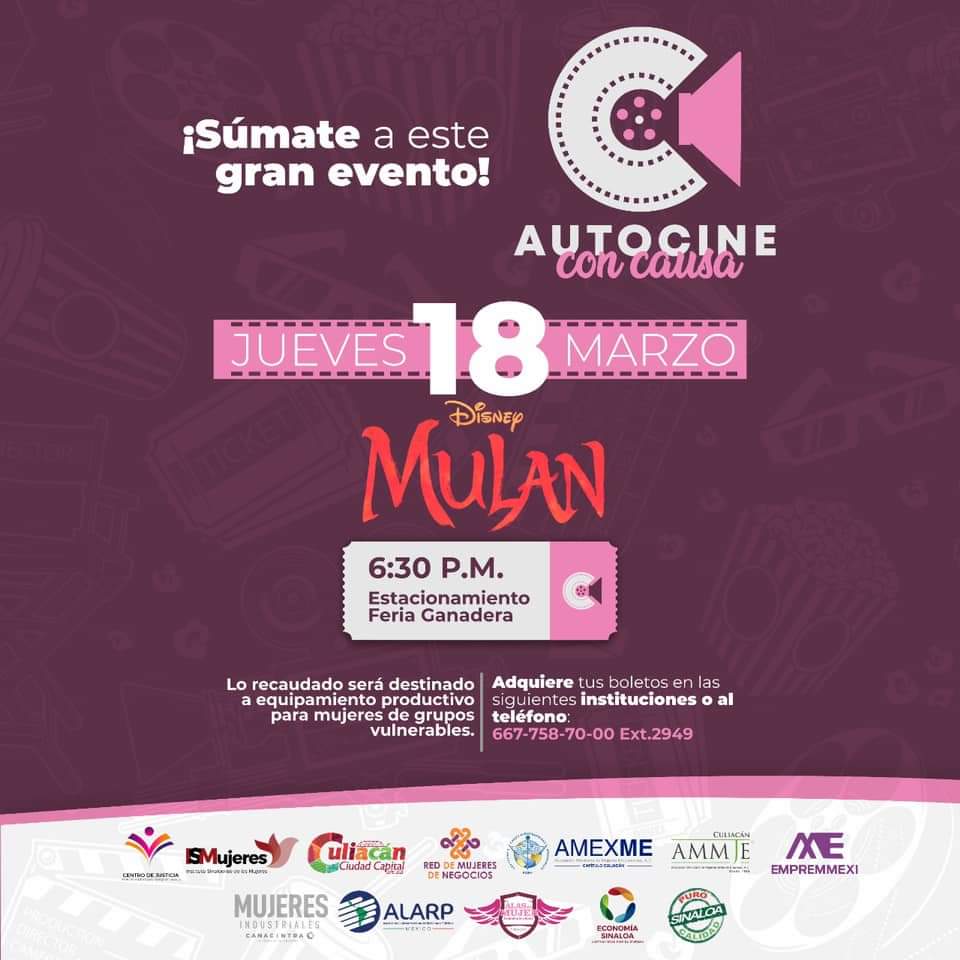Con la finalidad de apoyar la economía de mujeres pertenecientes a grupos vulnerables, la Secretaría de Economía llevará a cabo la función de “Autocine con Causa” en el estacionamiento de la feria ganadera el próximo jueves 18 de marzo a las 18: 30 horas con la película Mulán.