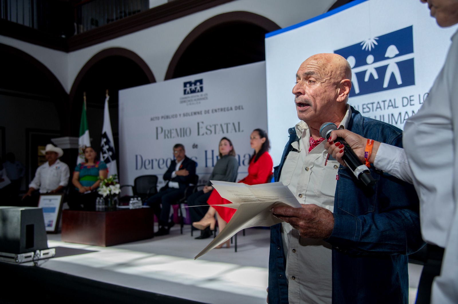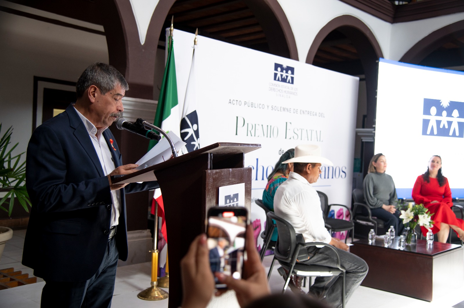 Durante el evento el Presidente de la CEDHS, doctor Oscar Loza Ochoa, enfatizó que en esta ocasión el Premio honra a quienes defienden los derechos de los pueblos originarios de Sinaloa con valor y perseverancia, y más que un homenaje aseguró que es un testimonio vivo de la fuerza de la resistencia social y el amor por su tierra, en este caso la Bahía de Ohuira que es un paraíso natural y un sitio de importancia mundial donde la pesquería de camarón está amenazada por un mega proyecto industrial, la proyectada planta de amoniaco.