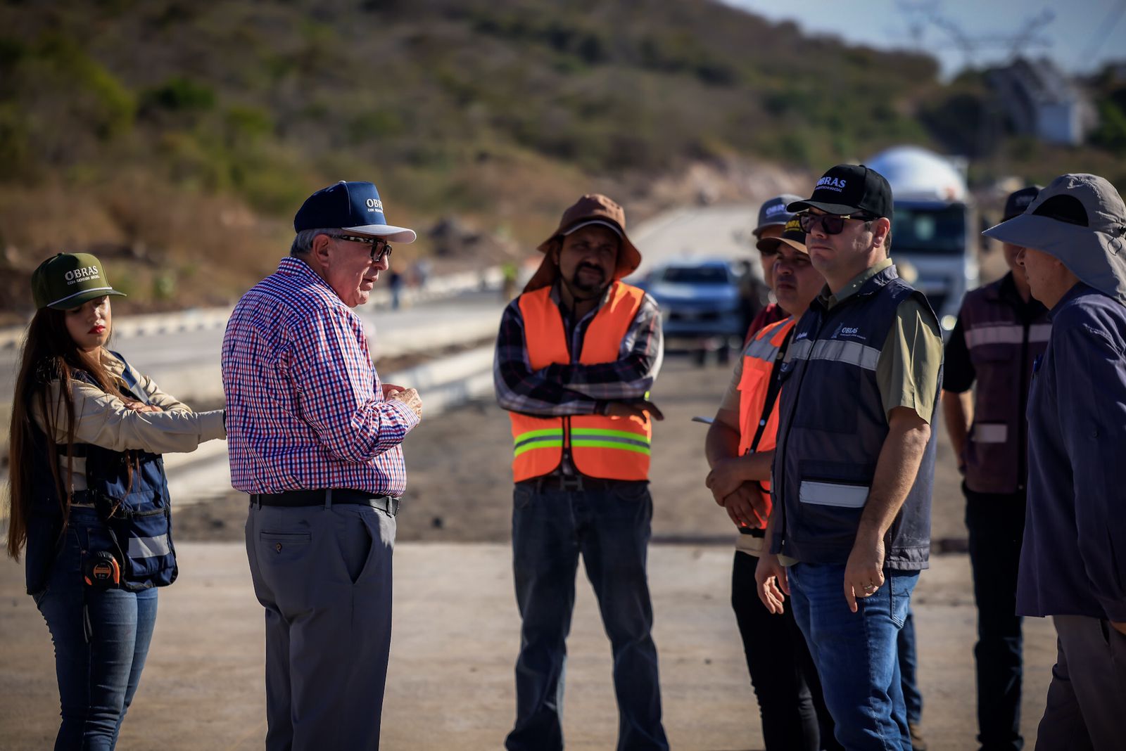 El mandatario estatal acompañado del secretario de Obras Públicas, Raúl Montero Zamudio y los supervisores Manuel Robles Montaño y Edgar Ulises Cerón, recorrió la obra constatando el buen ritmo de ejecución, destacando la pavimentación con concreto hidráulico de los primeros 700 metros lineales, y avance significativo en terracerías, subrasante y obra hidráulica.