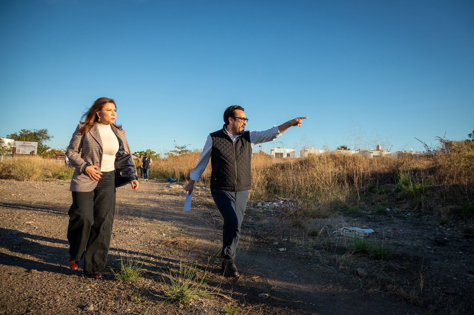 El alcalde Juan de Dios Gámez Mendívil y la secretaria de Educación Pública y Cultura del Estado, Gloria Himelda Félix Niebla, supervisaron el terreno donde se proyecta la construcción de un nuevo Centro de Bachillerato Tecnológico Industrial y de Servicios (CBTIS) en el fraccionamiento Valle de Encino en el sector Lomas de San Isidro.