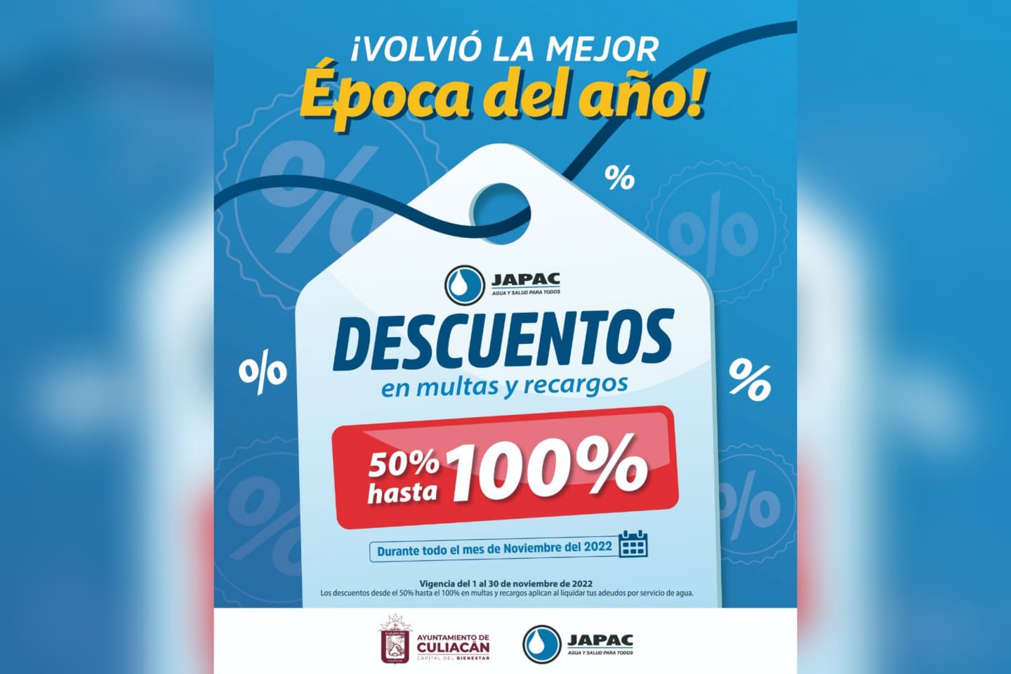 La Junta Municipal de Agua Potable y Alcantarillado de Culiacán informa que a partir de mañana 01 de noviembre inicia con la campaña en donde se contemplan descuentos desde el 50 hasta el 100% de descuento en multas y recargos.