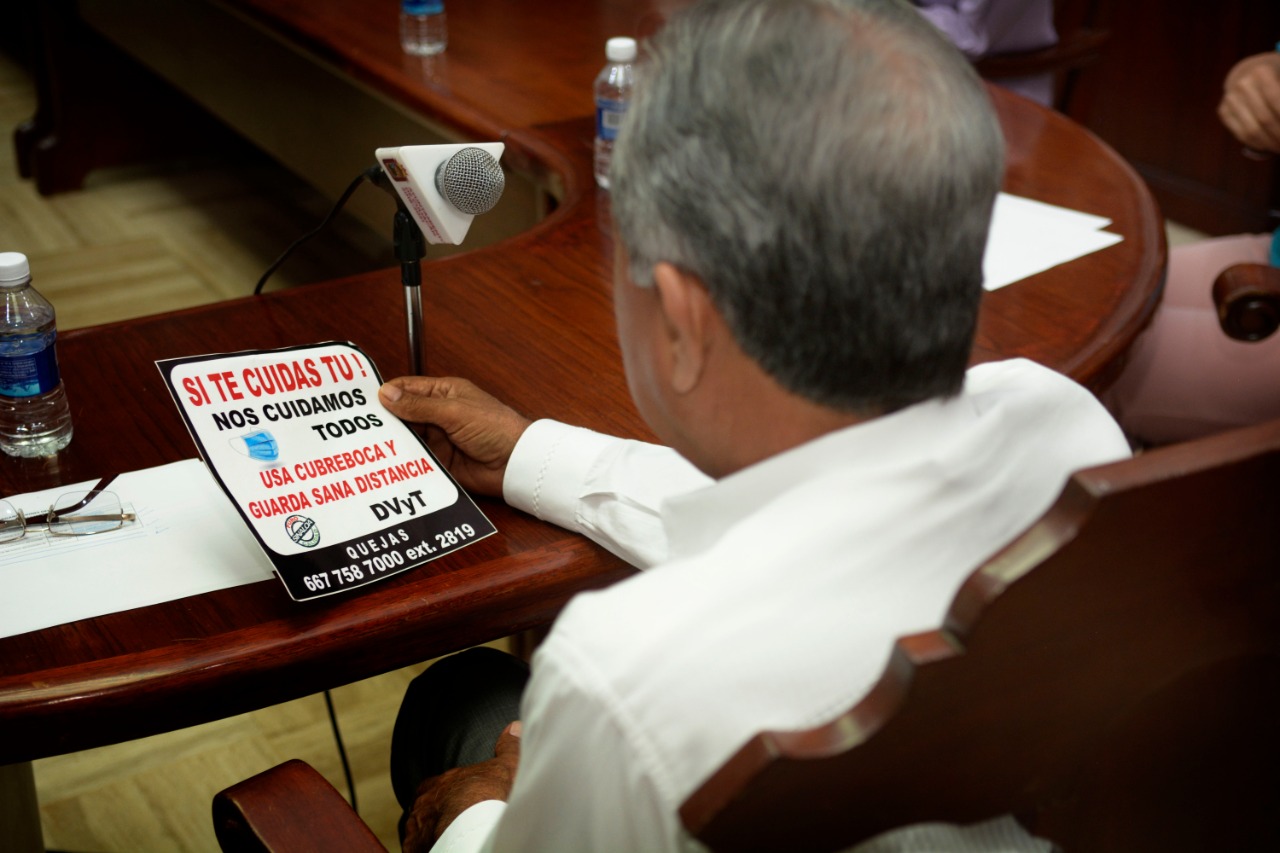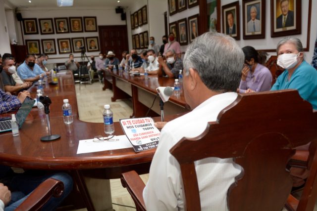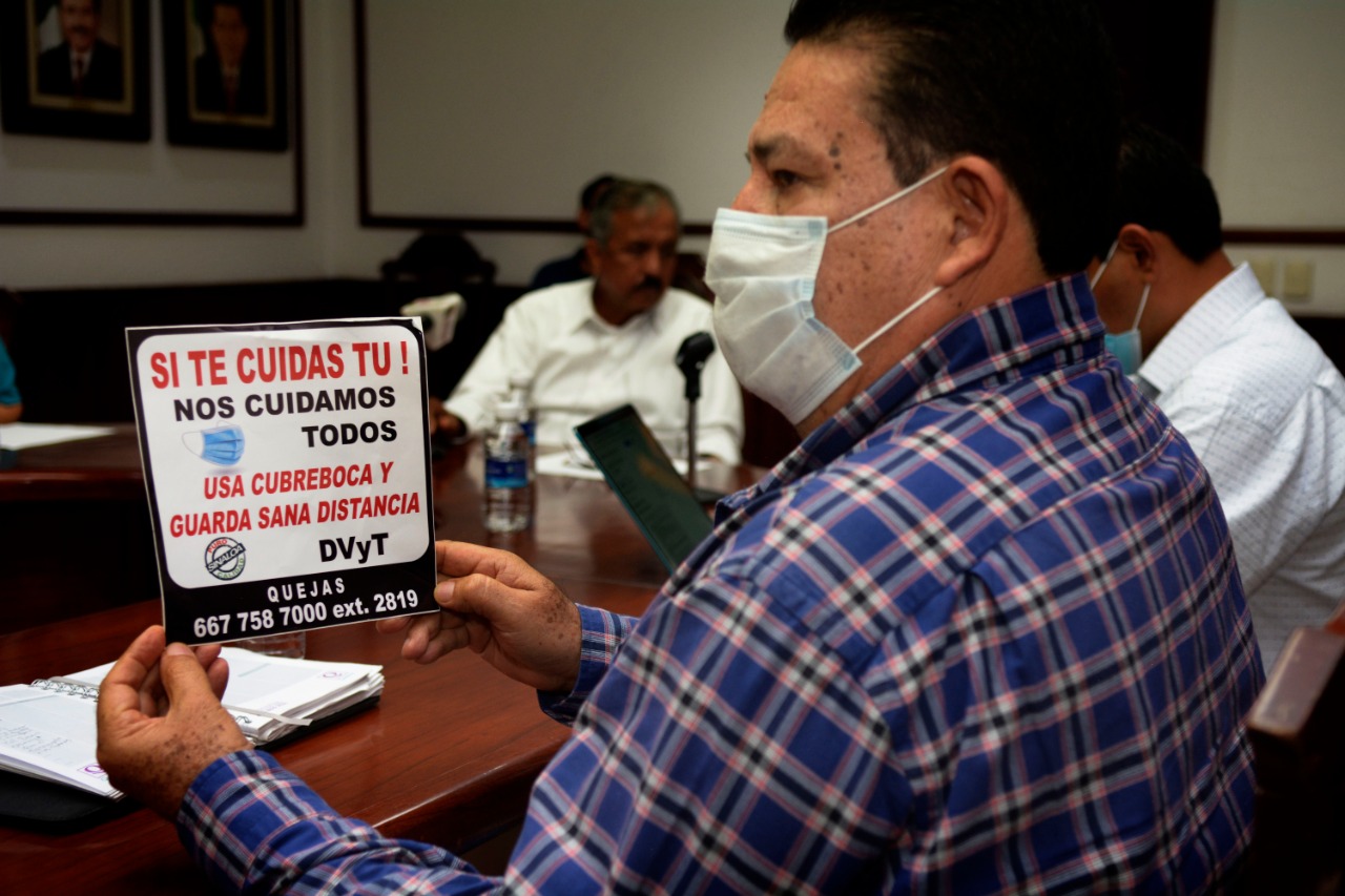 En reunión efectuada en Salón de Cabildos, el presidente municipal reiteró la importancia de seguir con la debida prevención, por ello se vigilará puntualmente que todos los usuarios y choferes usen cubrebocas y guarden la sana distancia, además de endurecer las sanciones a quienes no acaten.